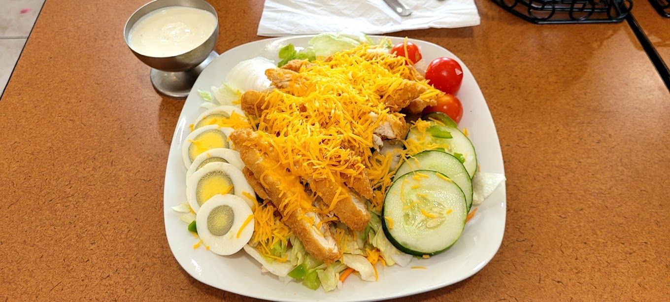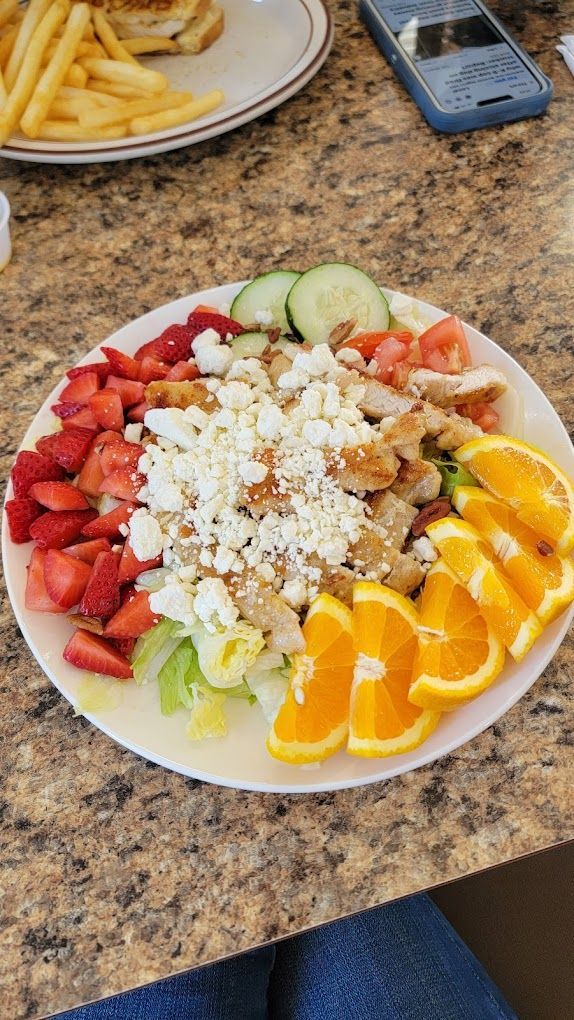 Grilled chicken, pecans, strawberry, eggs, and tomatoes served with strawberry vinaigrette and feta