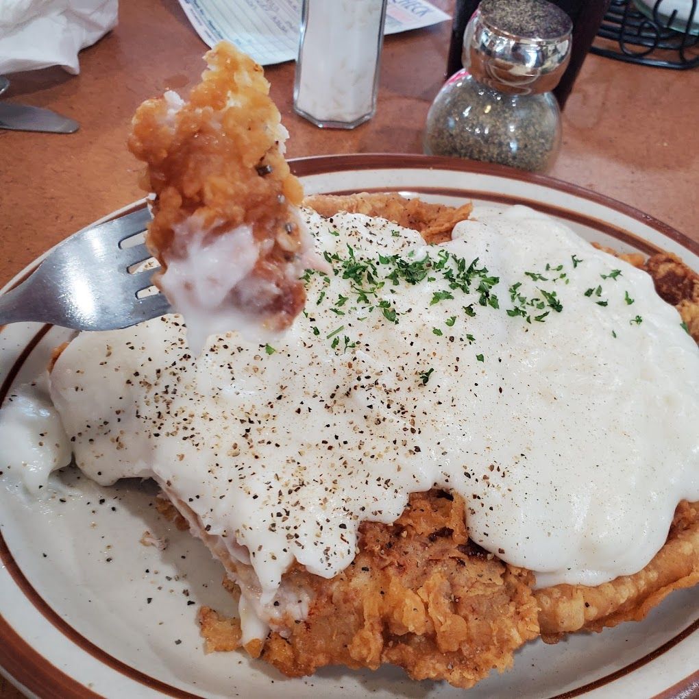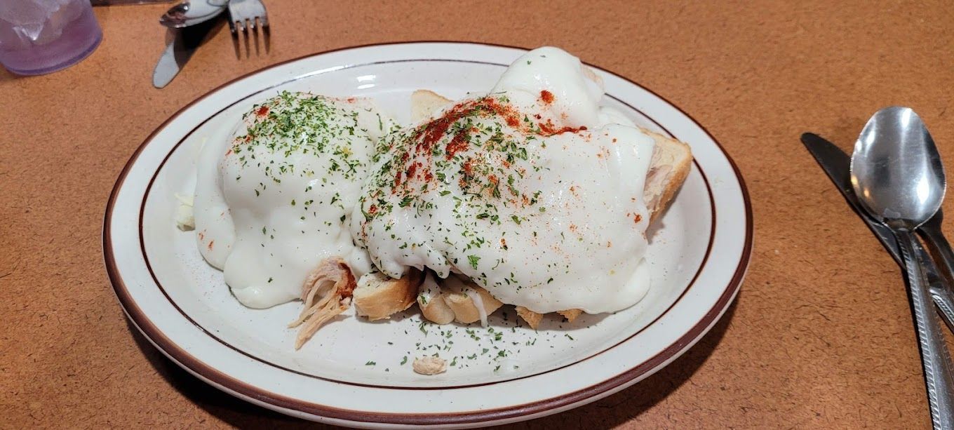 1/2 biscuits & gravy with two eggs on top, cheddar cheese, green peppers and onions. Served with hash browns. Sausage gravy served until 2pm daily Sundays till 3pm.