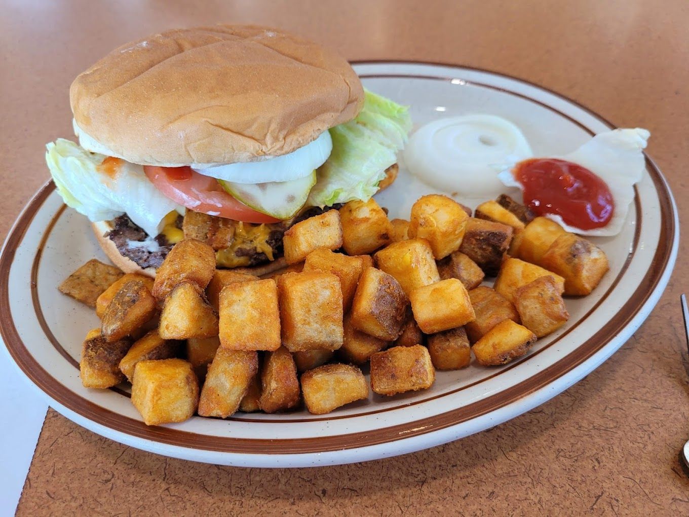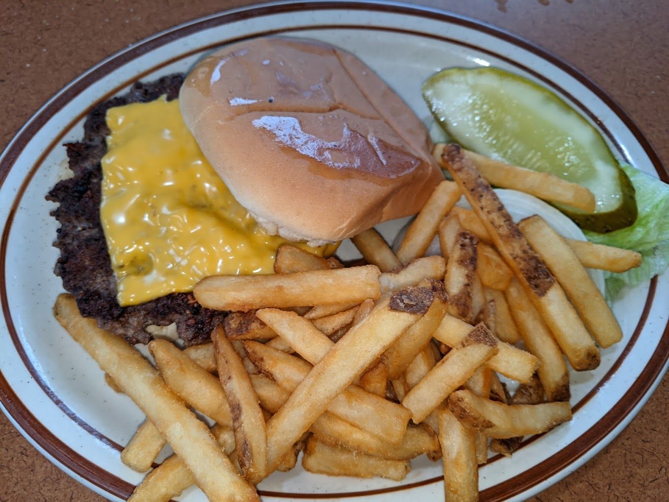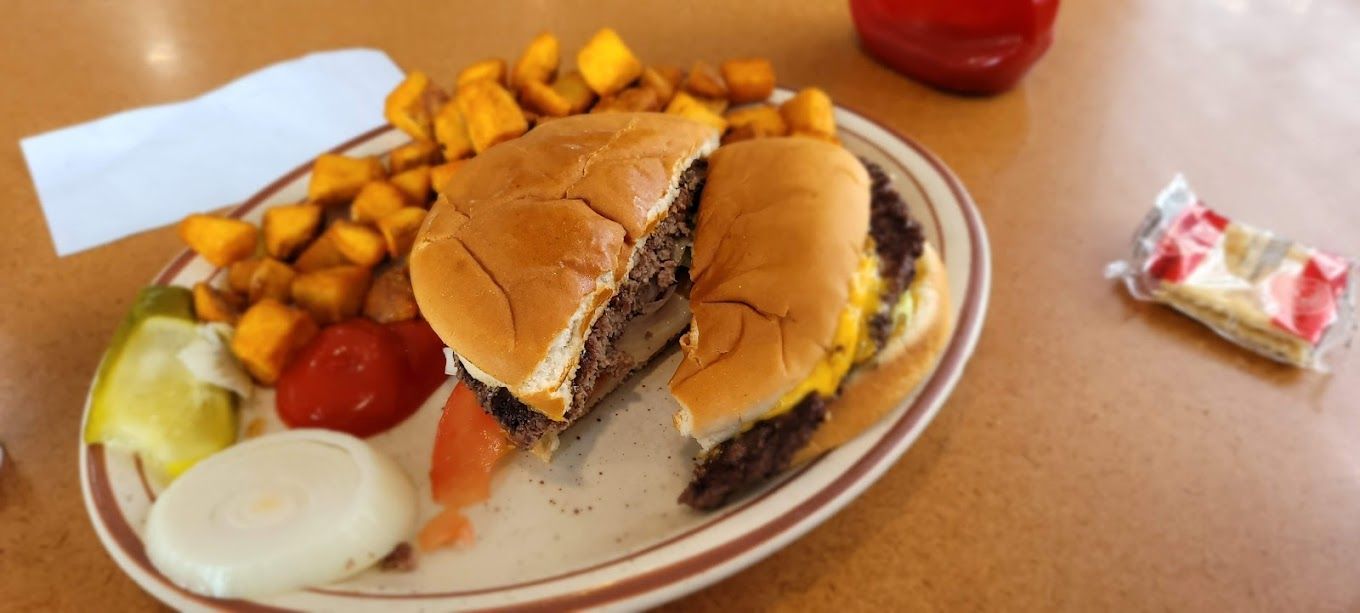 Hamburger, grilled onions,American cheese on grilled rye.