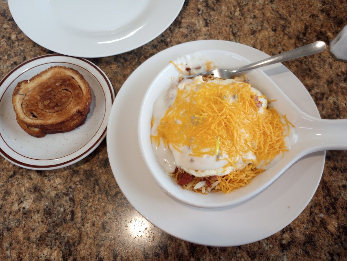 Hash browns topped with bacon, sausage, scrambled eggs, gravy, and cheese. Served with Vlore cinnamon toast.