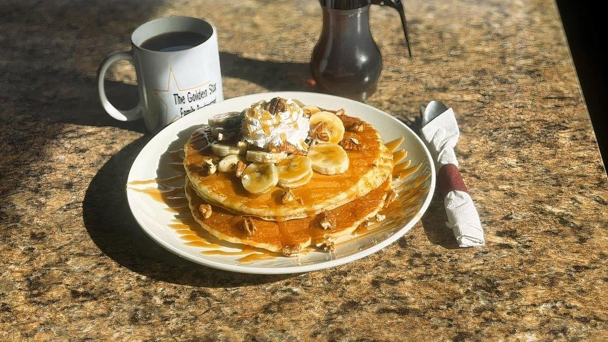 Vanilla pancake topped with pecans, banana and caramel drizzle. Add fresh fruit: strawberries,bananas, or blueberries 2.75 each.