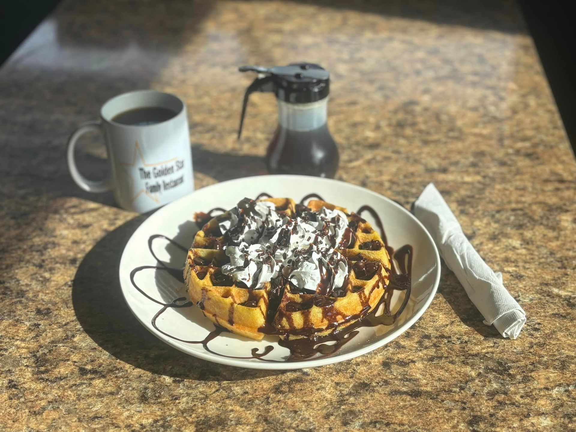 Vanilla waffle topped with chocolate chips and a drizzle of chocolate. Add fresh fruit: strawberries,bananas, or blueberries 2.75 each. Add toast 2.00. Add sausage, bacon, or ham 3.75. Ask for whipped cream, it’s free.